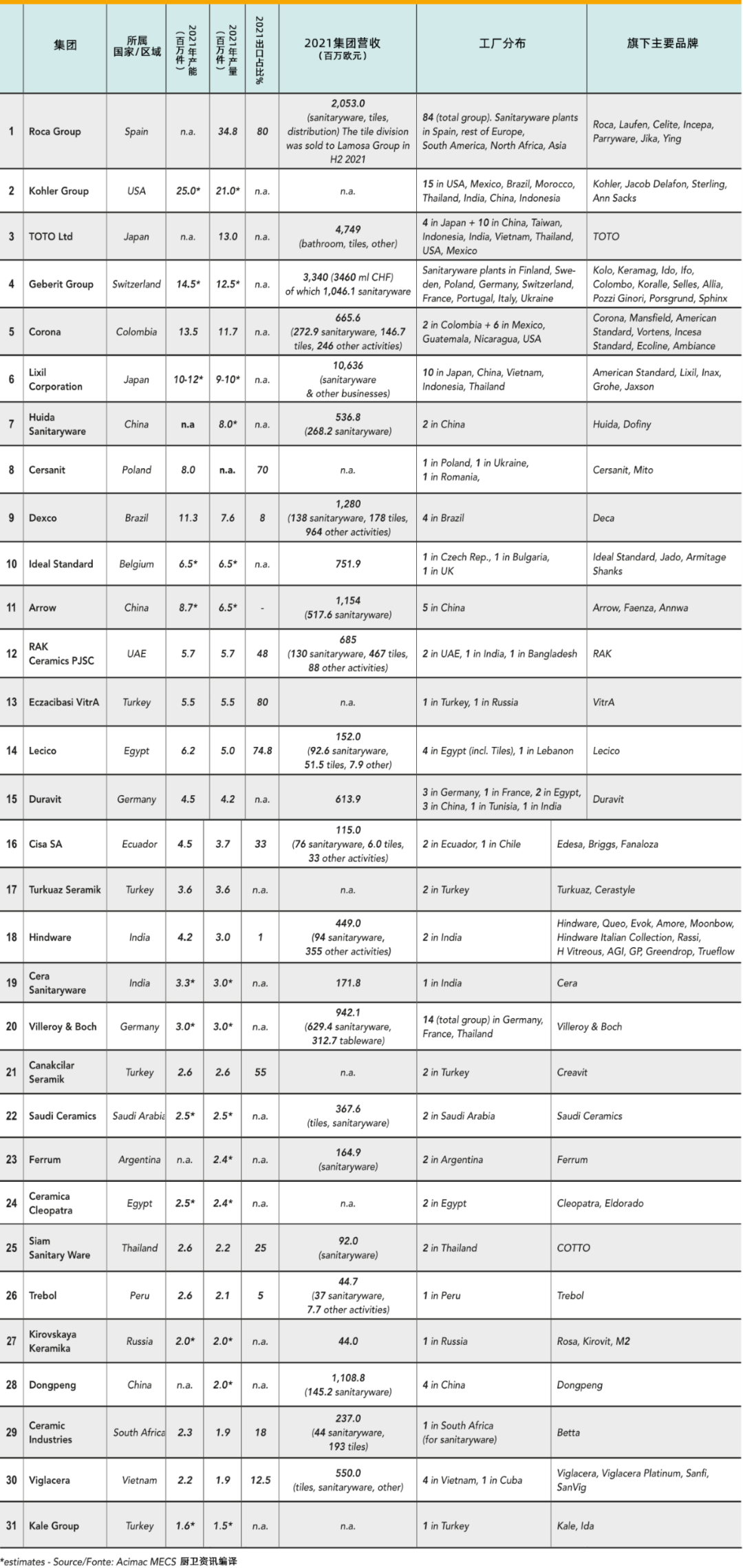 12月16日,Ceramic World Review发布2021年度全球卫生陶瓷集团排名。厨卫资讯进行了编译和梳理。(该榜单仅统计卫生陶瓷版块相关情况,其余五金、淋浴房、家具类、塑料类等未被统计)首先,相比2020年度,中国仍旧维持了三家企业集团上榜的情况。惠达位列第7、箭牌位列第11,排名无变动,东鹏上升一位,进入28位。值得注意的是,印度企业排名普遍下滑,泰国暹罗集团上升两位。全球前三中,凭