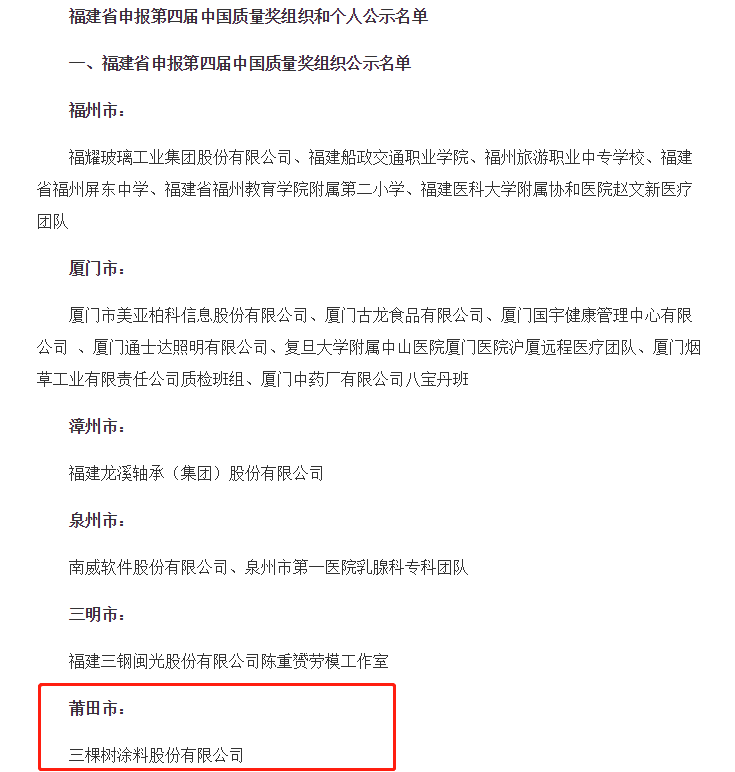 2021年5月17日,福建省市场监督管理局公示18个组织、7名个人拟进入申报参加第四届中国质量奖的评选名单。其中,三棵树涂料股份有限公司也在评选名单中。