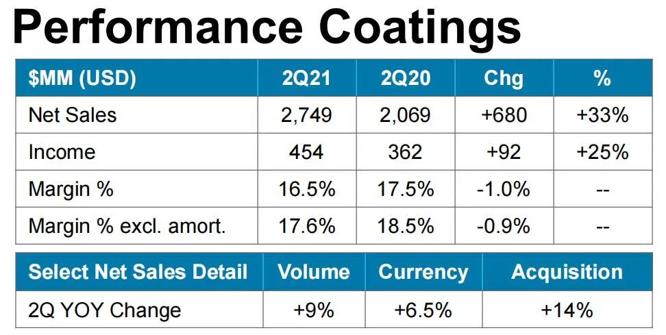 2021年第二季度高性能涂料部门实现销售额为27.49亿美元,同比增长33%。部门利润为4.54亿美元,同比增长25%。其中,与上一年相比,销售价格上涨了3%,销量增加了9%。有利的外币换算对净销售额的影响约为7%,与收购相关的销售额同比增长了14%。