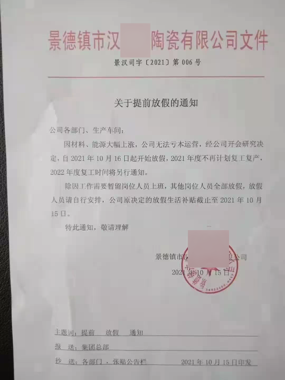 该《关于提前放假的通知》显示,因材料、能源大幅上涨,公司无法亏本运营,江西景德镇市汉**陶瓷有限公司决定自10月16日开始放假,2021年度不再计划复工复产,2022年度复工时间将另行通知。