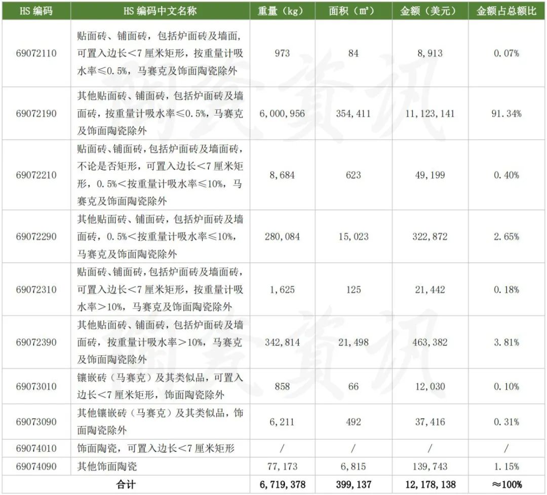 此外,根据海关统计数据,9月,中国进口了23.56万㎡的意大利瓷砖,均价为34.43美元/㎡;进口了8.95万㎡的西班牙瓷砖,均价为28.58美元/㎡。