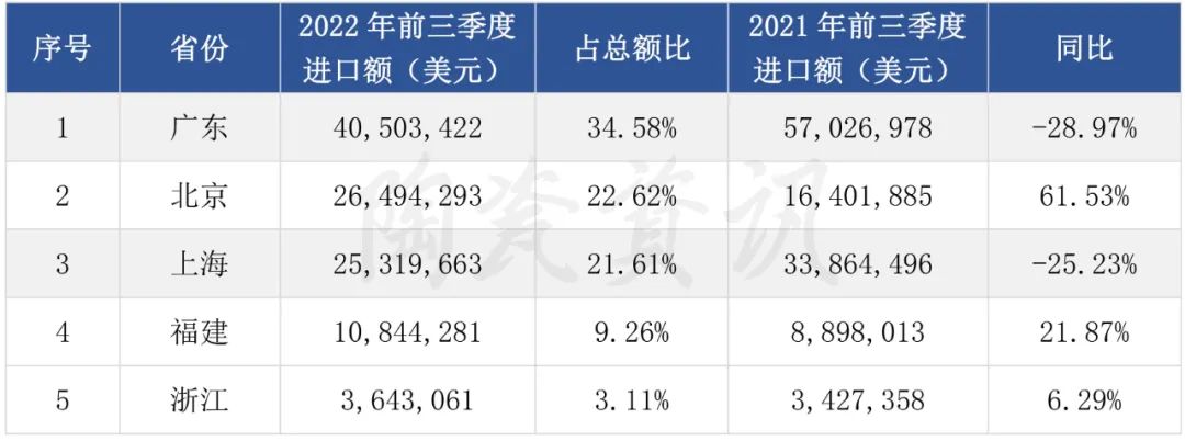 陶瓷资讯根据海关相关统计分析,前三季度,我国陶瓷砖进口额前五位的省(市)分别是广东、北京、上海、福建和浙江。其中,北京同比上涨61.53%,广东同比下降28.97%。
