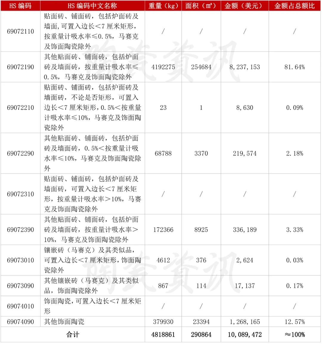 根据上表的统计数据可知,11月份,我国进口量较大是HS编码为69072190的陶瓷砖,占进口总额的81.64%;其次是HS编码为6904090,占进口总额的12.57%。